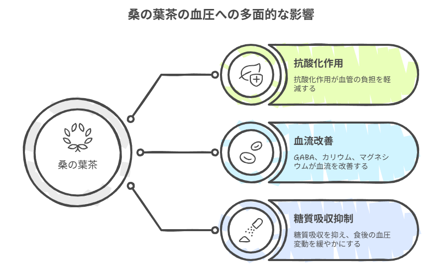 桑の葉には、糖質の吸収を穏やかにする成分が含まれており、これが食後の血圧変動を緩やかにすることにつながります。